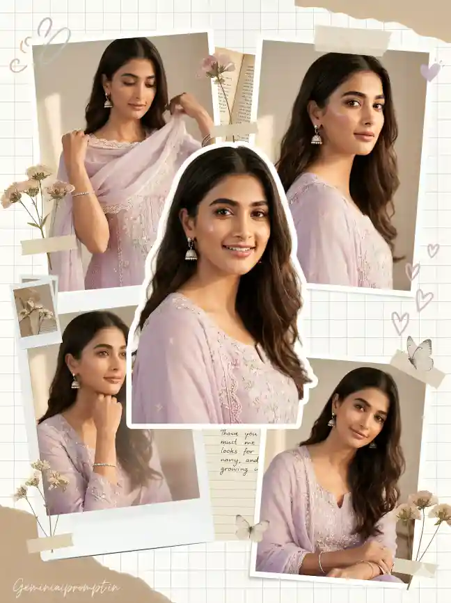(Use uploaded reference face exactly, zero modification) FACE LOCK — ZERO MODIFICATION POLICY Face must remain 100% identical to the uploaded reference image. Do not reshape jawline, eyes, nose, lips or hairstyle. No beautification filters, smoothing effects or artificial skin changes allowed. Preserve natural skin texture, facial proportions and hair details so the identity remains perfectly recognizable in ultra-HD clarity. ASPECT RATIO • 3:4 vertical STYLE Ultra-realistic Pinterest scrapbook collage aesthetic portrait with dreamy feminine moodboard design. Professional DSLR fashion portrait combined with scrapbook collage elements. 8K ultra-high resolution. SCENE DESCRIPTION Create a soft aesthetic scrapbook collage featuring multiple portraits of the same girl wearing a pastel lavender embroidered suit arranged in a Pinterest-style moodboard composition. OUTFIT DETAILS A pastel lavender traditional embroidered suit with delicate floral threadwork, paired with a light chiffon dupatta with lace edges. ACCESSORIES Elegant small pearl jhumka earrings, thin silver bracelet, and minimal bangles. HAIRSTYLE Long dark hair styled in soft natural waves flowing over the shoulders. MAKEUP Natural glowing makeup with light blush, winged eyeliner and glossy rose lips. COLLAGE COMPOSITION • Main portrait: confident smile looking directly at camera • Side portrait: looking slightly away with soft expression • Top frame: adjusting dupatta near shoulder • Bottom frame: relaxed pose with gentle smile Each portrait appears like cut-out photos layered on scrapbook paper. SCRAPBOOK DECOR ELEMENTS Add decorative elements including: • pressed flowers • vintage book pages • Polaroid frames • handwritten notes • paper tape strips • delicate butterflies and small hearts BACKGROUND Soft white scrapbook grid background with beige paper textures and pastel doodles. LIGHTING Soft natural indoor sunlight creating warm highlights and dreamy glow. CAMERA & STYLE Captured using professional DSLR camera with 85mm portrait lens, producing extremely sharp facial clarity with soft aesthetic color grading. IMAGE QUALITY Ultra-HD skin detail, realistic fabric textures, Pinterest aesthetic collage layout. NEGATIVE PROMPT blur, distorted anatomy, cartoon style, CGI characters, extra limbs, watermark artifacts. TEXT / SIGNATURE Add “Geminiaiprompt.in” at the bottom-left corner, HANDWRITTEN SIGNATURE-STYLE typography, thin cursive strokes, small size, subtle premium elegance, white or soft off-white color.