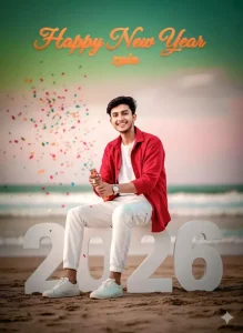 A realistic, high-quality full body photo of a handsome young Indian boy sitting casually on large, white 3D numbers '2026' placed on a sandy beach. The boy is smiling and looking at the camera, wearing a red open shirt over a white t-shirt, white cargo pants, and white sneakers. He is holding a party popper in his hand. Colorful confetti is falling all around. The background catures a beautiful bokon green with gradient Heal and pink and soft ocean waves. The text Happy New Year is write.