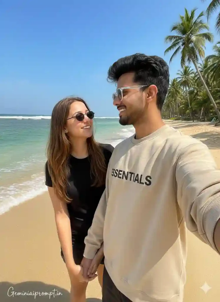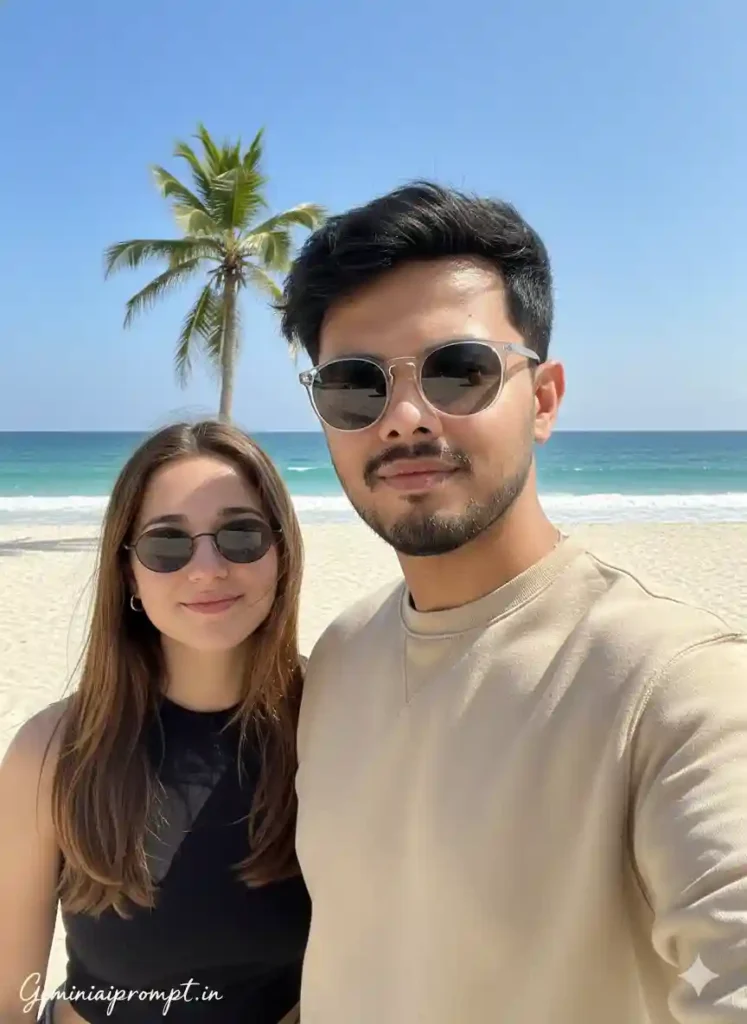 FACE LOCK INSTRUCTIONS (STRICT – 100% MATCH) Use the uploaded reference faces only. Both faces must remain EXACTLY the same. Do NOT change: Eye shape or size Nose structure Lip curve Beard thickness Jawline Skin tone Facial proportions No beautification. No face reshaping. No artificial smoothing. Natural human skin texture and pores must remain visible. SCENE DESCRIPTION Ultra-realistic tropical beach selfie during bright midday sunlight. The couple is standing near the shoreline where turquoise ocean waves gently meet the sand. Clear blue sky with scattered soft clouds. Tall coconut palm tree slightly visible behind them, leaves swaying naturally. The man is holding the phone slightly above eye level for a natural candid selfie perspective. His right arm wrapped comfortably around the woman’s shoulder. She leans slightly toward him with relaxed posture. OUTFIT DETAILS Man: Beige oversized “ESSENTIAL” sweatshirt Transparent sunglasses reflecting ocean light Light natural stubble Thick styled hair swept slightly back Minimal casual wristwatch Woman: Black fitted summer top Round black sunglasses Long straight hair flowing naturally Soft minimal makeup Clothing must show realistic fabric folds and daylight texture. EXPRESSION DETAILS Soft natural smile Relaxed eyes Comfortable romantic vibe Candid vacation happiness No exaggerated emotion. LIGHTING DETAILS Bright natural sunlight Soft realistic shadows Balanced exposure True-to-life skin tones Subtle sunlight glow on hair edges No overexposure. No oversaturation. CAMERA & QUALITY Professional DSLR selfie look 85mm lens feel Ultra HD 8K resolution High dynamic range Sharp focus on faces Natural depth separation No CGI look No artificial blur TEXT / SIGNATURE Add “Geminiaiprompt.in” at the bottom-left corner, HANDWRITTEN SIGNATURE-STYLE typography, thin cursive strokes, small size, subtle premium elegance, white or soft off-white color. NEGATIVE PROMPT cartoon, anime, painting, CGI, over-smooth skin, plastic texture, blur, low resolution, distorted face, extra fingers, extra limbs, watermark (except signature), harsh highlights. ASPECT RATIO • 3:4 vertical