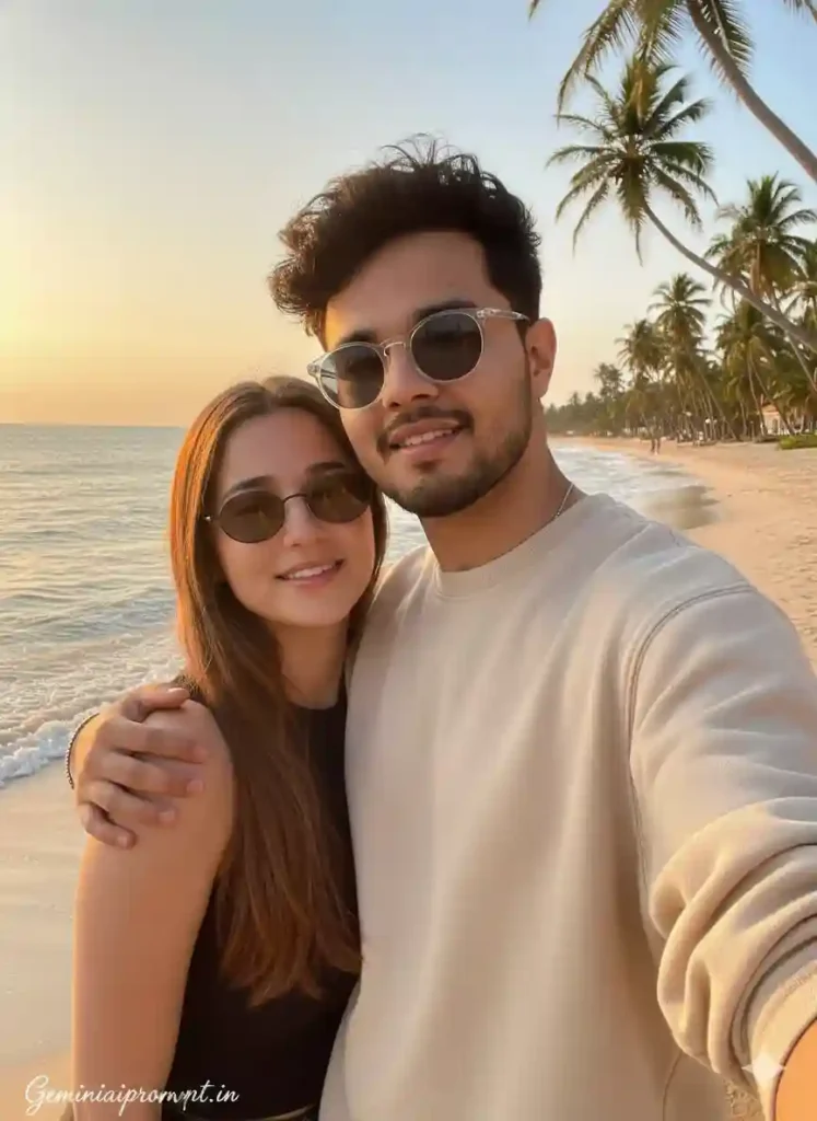 FACE LOCK — STRICT IDENTITY MATCH Use uploaded reference images for both individuals. Faces must remain EXACTLY identical to the reference images. Do NOT modify: Facial structure Eye shape or size Nose shape Lip curve Jawline Beard density or hairline Skin tone No beautification. No smoothing. No reshaping. No AI enhancement. Keep natural pores, realistic skin texture, subtle imperfections. SCENE CONCEPT Ultra-realistic golden hour tropical beach selfie. The couple is standing close together near the shoreline. The boy is holding the phone slightly above eye level for a natural selfie angle. His arm is gently wrapped around the girl’s shoulder. The ocean behind them glows with warm sunset reflection. Soft waves visible near feet. Tall palm trees slightly swaying in warm coastal breeze. OUTFIT DETAILS Boy: Light sand-colored oversized sweatshirt Clear transparent sunglasses Trimmed beard Voluminous styled hair with natural texture Minimal silver bracelet Girl: Long straight brown hair flowing naturally Black sleeveless top Round black sunglasses Minimal glossy lip shine Natural soft makeup Clothing must show realistic fabric folds and texture. EXPRESSION DETAILS Both smiling softly — candid romantic vibe. Teeth natural, no exaggerated smile. Relaxed eyes. Comfortable body language. LIGHTING Warm sunset lighting from left side. Golden rim light outlining hair and shoulders. Natural skin tone preserved. No overexposure. Balanced highlights and shadows. CAMERA & QUALITY Selfie framing — slightly tilted casual angle. Ultra HD 8K clarity. DSLR realistic look. Sharp focus on faces. Natural depth separation but no blur on facial features. No artificial filters. TEXT / SIGNATURE Add “Geminiaiprompt.in” at the bottom-left corner, HANDWRITTEN SIGNATURE-STYLE typography, thin cursive strokes, small size, subtle premium elegance, white or soft off-white color. NEGATIVE PROMPT cartoon, CGI, over-smooth skin, blur, motion blur, plastic look, extra fingers, distorted face, low resolution, watermark (except signature), oversaturated tones. ASPECT RATIO • 3:4 vertical