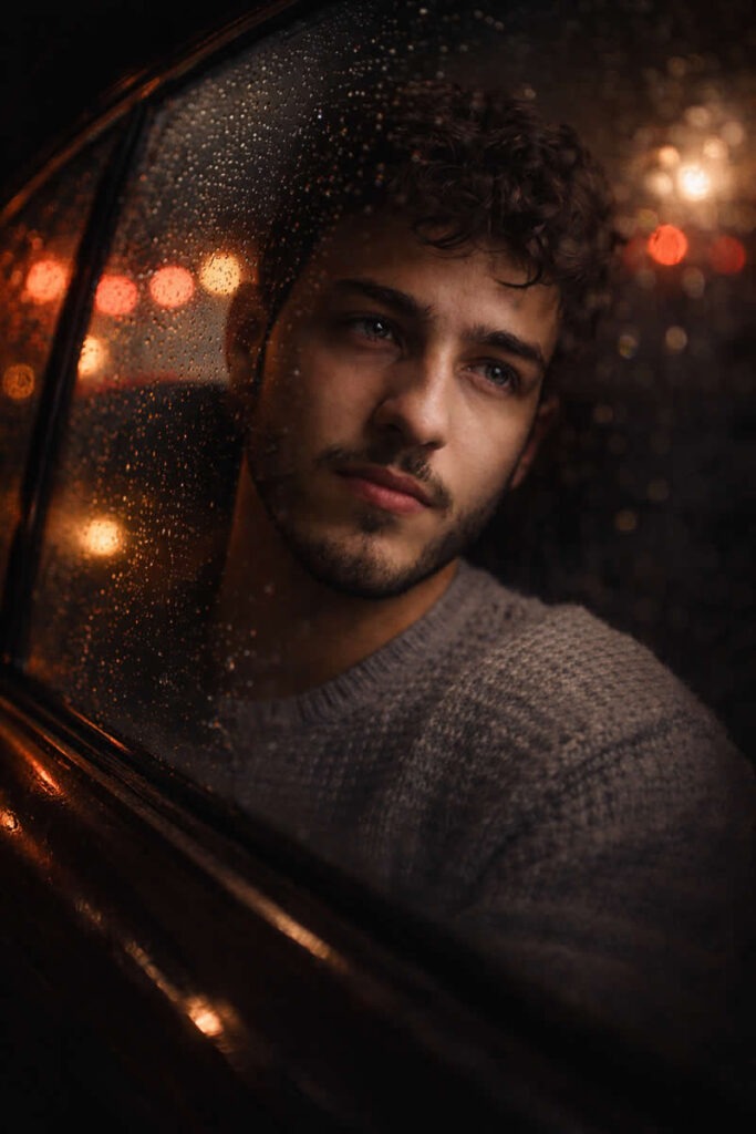 Prompt: "An intimate, cinematic close-up of a man sitting in the backseat of a moving taxi, seen through a rain-streaked window. His face exactly matches the uploaded reference image. He rests his head against the glass, wearing a soft knit sweater. City lights outside blur into red and amber bokeh streaks. Focus is sharp on his eyes through the wet glass, with raindrops slightly out of focus. Low, moody lighting from passing streetlights creates a quiet, emotional, memory-like atmosphere. Portrait Mode."