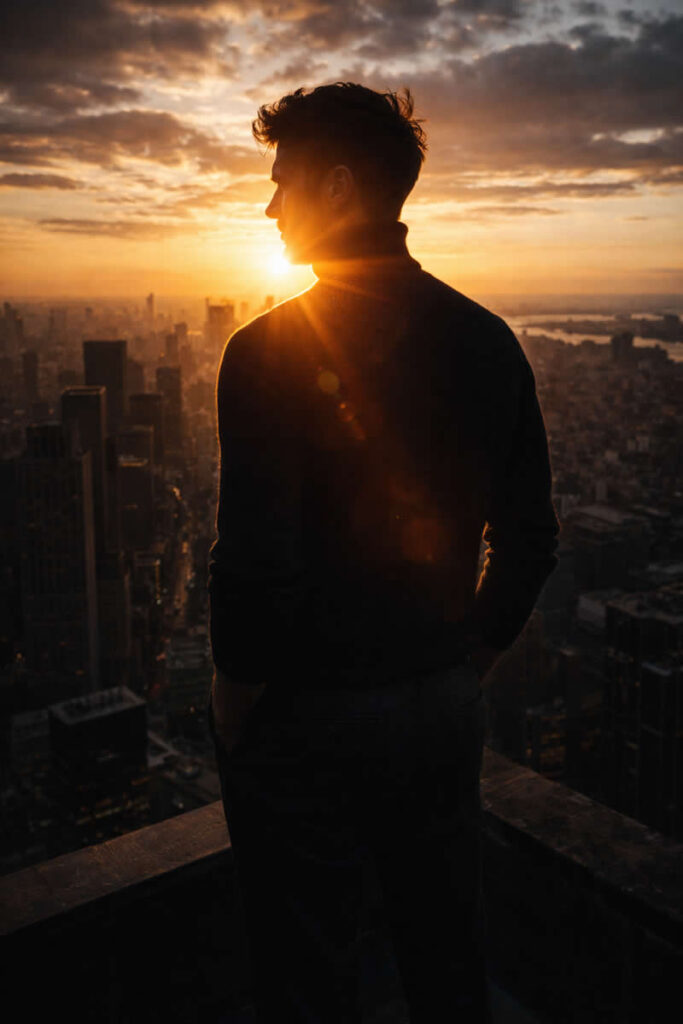 Prompt: "A wide cinematic shot from a skyscraper rooftop at golden hour, overlooking a vast city. The sun sets behind a male figure (use uploaded face as reference), creating a strong silhouette with golden lens flare. He wears quiet luxury clothing—a fitted cashmere turtleneck and tailored wool trousers. Wind blows his hair back naturally. Pure natural light forms a rim-lit halo around his profile. Shot on a 24mm lens with high contrast, deep shadows, and crushed blacks, emphasizing the scale of the city and the power of the lone figure. Portrait Mode"
