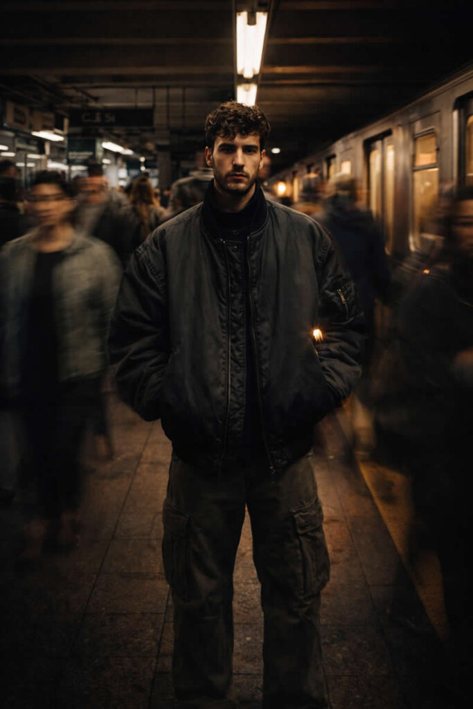Prompt: "A moody shot on a busy New York City subway platform during rush hour. A male subject (use face from reference image) stands still at the center, wearing an oversized Y2K-style bomber jacket and loose cargo pants. A slow shutter speed turns the moving crowd into blurred, ghost-like streaks, highlighting his isolation. Harsh fluorescent lights mix with the warm glow of an arriving train. Shot on a 35mm lens, capturing gritty textures and giving the scene an indie film still feel. Portrait Mode."