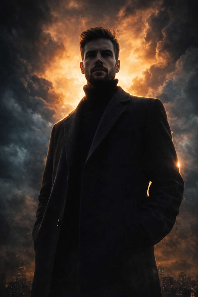 Prompt: "A cinematic low-angle medium shot of a stoic male figure (use uploaded face as reference) with a groomed beard and modern undercut hairstyle. He wears a dark charcoal overcoat and stands against a dramatic stormy sky. Massive dark clouds part behind him, revealing an intense golden-orange light like a powerful sunset or supernatural rift. Strong backlighting creates a glowing rim light around his silhouette, leaving his face in soft shadow. High-contrast, volumetric lighting with a teal-and-orange color grade, evoking a heroic movie poster. Hyper-realistic, cinematic quality. Portrait Mode."