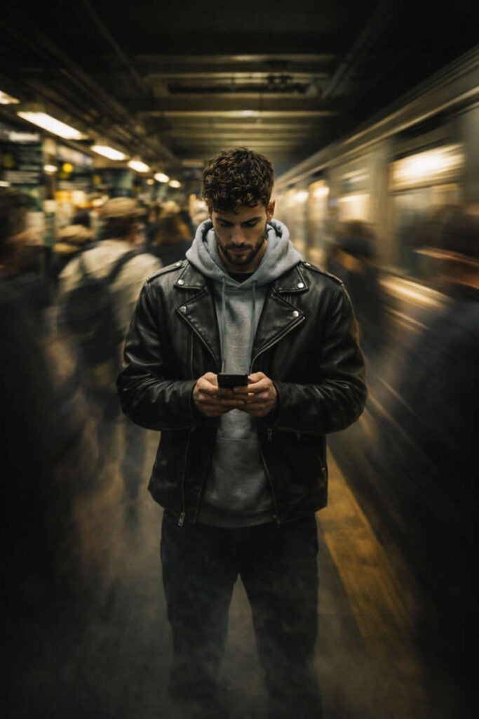 Prompt: "A hyper-realistic wide-angle shot on a busy New York subway platform. The subject (use uploaded face as reference) stands still at the center, wearing a leather biker jacket and grey hoodie, looking at their phone. Everyone else and the arriving train are motion-blurred into light streaks, creating a tunnel-vision effect. Harsh yellow-green subway lighting. 2:3 aspect ratio."