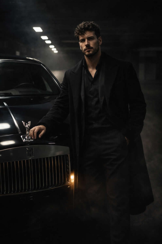 Prompt: "A hyper-realistic cinematic medium-full shot of a powerful male figure (use uploaded face as reference) standing beside a glossy black Rolls-Royce Ghost in a dark underground parking garage. He wears a long black tailored coat over a charcoal suit, open collar. One hand rests on the hood ornament. Dramatic overhead lights highlight the car and his face while the background fades into darkness. Subtle smoke and dust add atmosphere. High-contrast, elite luxury mood, ultra-realistic quality."