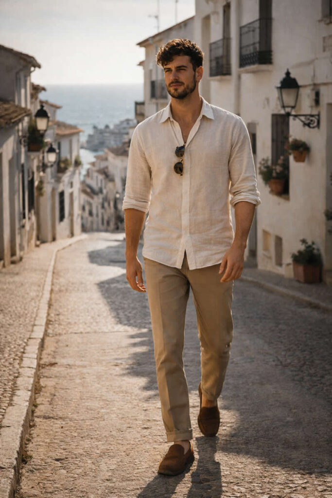 Prompt: "A photorealistic sunlit medium-long shot of a male subject (use uploaded face as reference) walking along a Mediterranean coastal street in early morning. He wears a white linen shirt with rolled sleeves, beige trousers, and brown suede loafers, with sunglasses hanging from his shirt. Whitewashed buildings, terracotta rooftops, and hints of turquoise sea in the background. Soft morning sunlight creates warm tones and gentle shadows. Calm, refined travel editorial mood."