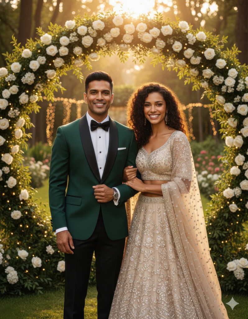 Professional Indian couple portrait, full-length shot. The couple is dressed in elegant formal wear — man in an emerald-green tuxedo, woman in a champagne lehenga with crystal beadwork. They are standing close, smiling naturally. The setting is an outdoor garden reception surrounded by lush greenery. Backdrop Details: circular floral arch of white roses and green foliage illuminated with fairy lights. Lighting: golden-hour sunlight with backlight accents. Mood: regal, joyful, and romantic. Style: cinematic realism with shallow depth of field. Camera Angle: eye level. Color Palette: emerald, gold, and cream. End Result: a vibrant and luxurious garden wedding reception photo.
