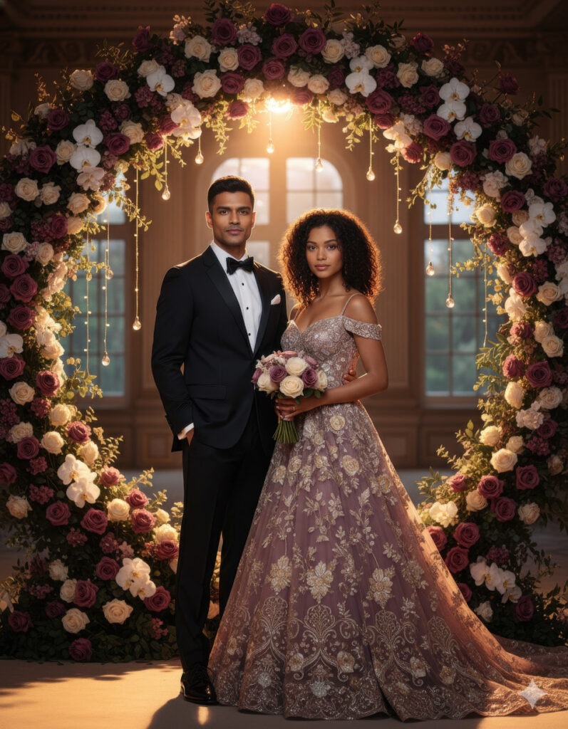 Professional Indian couple portrait, full-length shot. The man wears a classic black tuxedo while the woman wears a mauve lace gown. They’re holding hands under a floral curtain of pink and white blooms. Lighting: soft professional glow with fairy light halo. Mood: intimate and dreamy. Style: fine-art portrait with creamy background blur. Color palette: soft mauves and pinks. End Result: a highly detailed, realistic image that radiates love and sophistication.