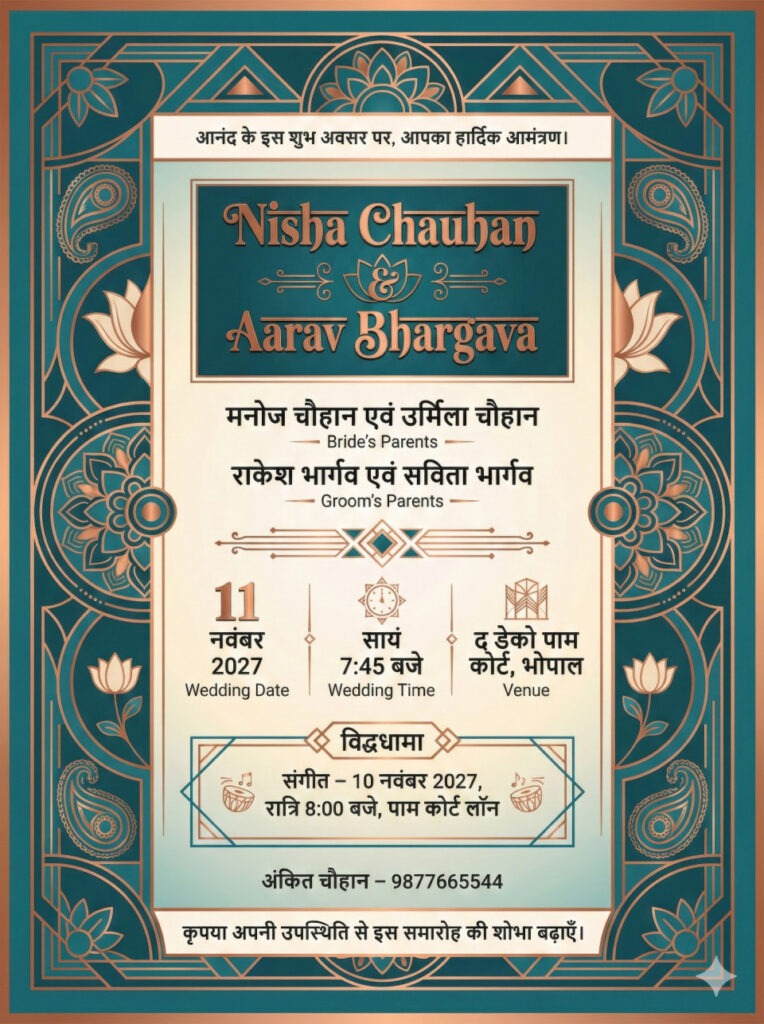 Create an Indian Hindu wedding invitation card in Hindi using the following customizable parameters: a vertical 6x8 inch layout, 4K print-ready quality, CMYK-safe, featuring a geometric art deco aesthetic with teal (#1B6F7A), copper (#B86E52) & cream white (#FFF7EE). Include subtle gradient background, and surround the card with geometric frame borders incorporating motifs of abstract mandalas, lotus-lines, and deco paisleys arranged symmetrically. Use modern-traditional hybrid Devanagari typography with names in bold ornate style. Maintain a centered geometric layout. Ensure the following Hindi text appears exactly as provided: Opening Line: 'आनंद के इस शुभ अवसर पर, आपका हार्दिक आमंत्रण।' Bride Name: 'Nisha Chauhan' Groom Name: 'Aarav Bhargava' Bride’s Parents: 'मनोज चौहान एवं उर्मिला चौहान' Groom’s Parents: 'राकेश भार्गव एवं सविता भार्गव' Wedding Date: '11 नवंबर 2027' Wedding Time: 'सायं 7:45 बजे' Venue: 'द डेको पाम कोर्ट, भोपाल' RSVP: 'अंकित चौहान – 9877665544' Wedding Functions: 'संगीत – 10 नवंबर 2027, रात्रि 8:00 बजे, पाम कोर्ट लॉन' Closing Line: 'कृपया अपनी उपस्थिति से इस समारोह की शोभा बढ़ाएँ।'. Add copper metallic accents for geometric brilliance.