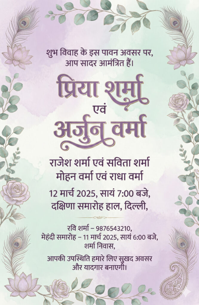 Create an Indian Hindu wedding invitation card in Hindi using a vertical 5.5x8.5 inch layout, 4K print-grade quality, CMYK-safe color mode, featuring a botanical watercolor aesthetic with a palette of lavender (#C7A4E4), pastel mint (#CFF0DA), and pearl white (#FAF9F6). Add a soft watercolor bloom background texture with a botanical frame of eucalyptus and rose-vine edges. Incorporate motifs such as peacock feathers, lotus, and paisley placed elegantly along corners. Use serif Devanagari typography with the names highlighted in grand style, followed by hierarchical details. Maintain a balanced symmetrical layout. Include the Hindi text exactly as provided: शुभ विवाह के इस पावन अवसर पर, आप सादर आमंत्रित हैं।, Priya Sharma, Arjun Verma, राजेश शर्मा एवं सविता शर्मा, मोहन वर्मा एवं राधा वर्मा, 12 मार्च 2025, सायं 7:00 बजे, दक्षिणा समारोह हाल, दिल्ली, रवि शर्मा – 9876543210, मेहंदी समारोह – 11 मार्च 2025, सायं 6:00 बजे, शर्मा निवास, आपकी उपस्थिति हमारे लिए सुखद अवसर और यादगार बनाएगी। Add subtle metallic accents to floral motifs for a soft premium shine.