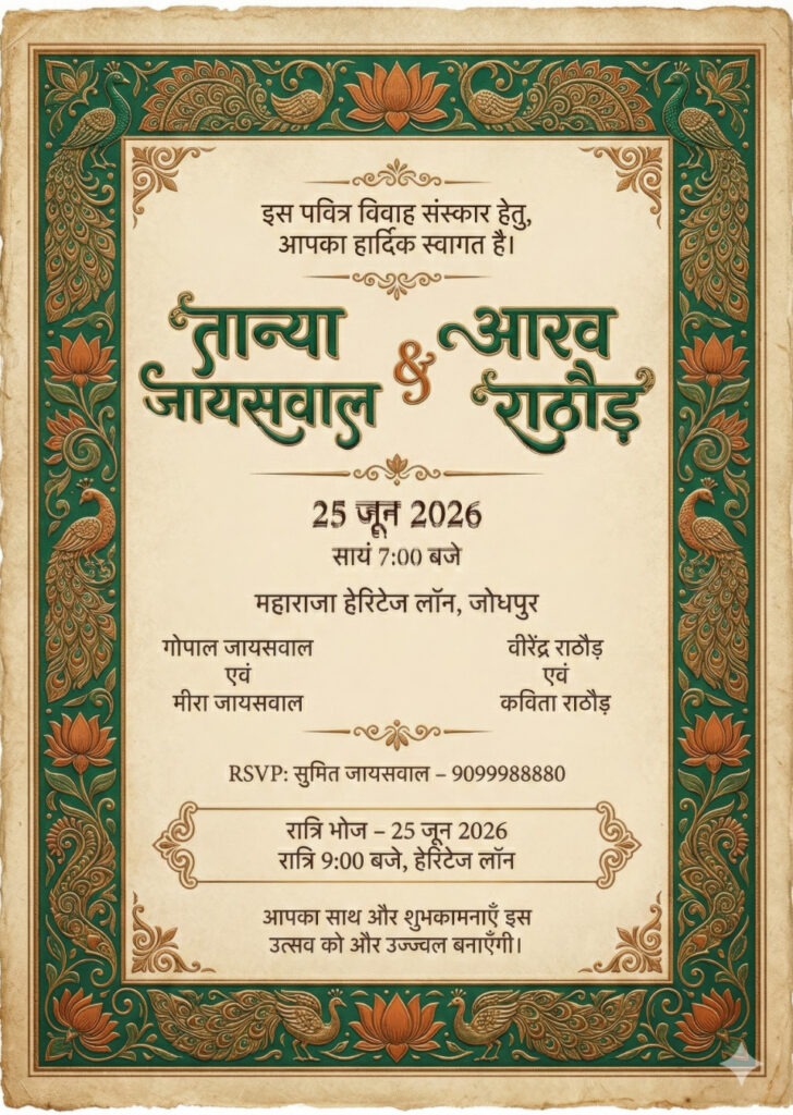 Create an Indian Hindu wedding invitation card in Hindi using the following customizable parameters: a vertical 5x7 inch layout, 5K print-ready quality, CMYK-safe palette, featuring a royal rustic aesthetic with emerald green (#0C5D44), rustic orange (#C26A3D) & antique beige (#F5E8D2) scheme. Include matte parchment background, and surround the card with ornate traditional borders incorporating peacock, mandala, and lotus arranged symmetrically across corners, sides, or central dividers. Use serif Devanagari typography with a clear hierarchy: bride and groom names in largest ornate Devanagari, followed by date, time, venue, parents’ names, RSVP, and function details in elegant, legible Devanagari. Maintain a balanced symmetrical layout with generous margins and premium printing aesthetics. Ensure all the following Hindi text appears exactly as provided and positioned beautifully: Opening Line: 'इस पवित्र विवाह संस्कार हेतु, आपका हार्दिक स्वागत है।' Bride Name: 'Tanya Jaiswal' Groom Name: 'Aarav Rathod' Bride’s Parents: 'गोपाल जायसवाल एवं मीरा जायसवाल' Groom’s Parents: 'वीरेंद्र राठौड़ एवं कविता राठौड़' Wedding Date: '25 जून 2026' Wedding Time: 'सायं 7:00 बजे' Venue: 'महाराजा हेरिटेज लॉन, जोधपुर' RSVP: 'सुमित जायसवाल – 9099988880' Wedding Functions: 'रात्रि भोज – 25 जून 2026, रात्रि 9:00 बजे, हेरिटेज लॉन' Closing Line: 'आपका साथ और शुभकामनाएँ इस उत्सव को और उज्ज्वल बनाएँगी।'. Add embossed texture to motifs for richness while preserving legibility and authenticity.