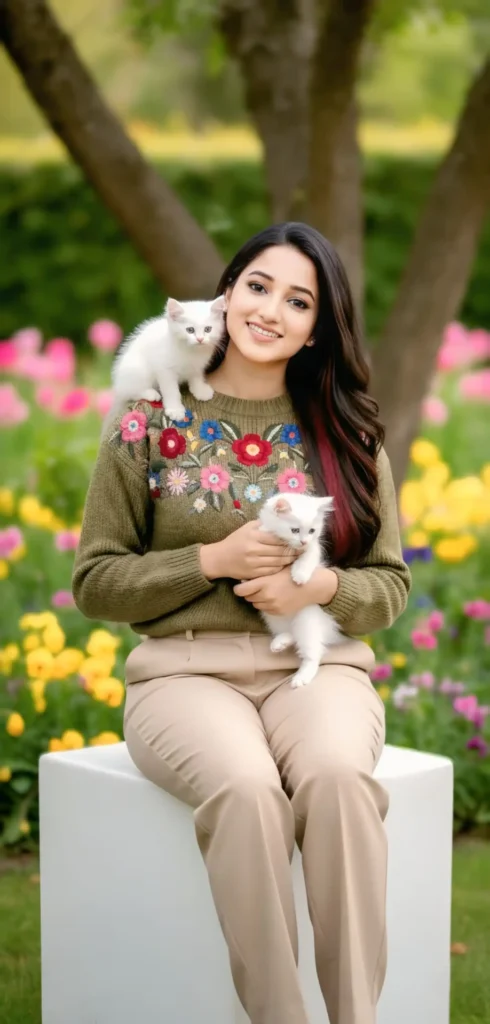 A young woman with a warm smile, wearing a stylish green sweater with embroidered floral details, and beige pants. She is sitting on a white cube in a vibrant garden setting with blooming flowers and a large tree in the background. She has two small, fluffy white kittens with her; one is playfully perched on her shoulder, and the other is cradled in her arms. The overall mood is cheerful and natural, with soft lighting.