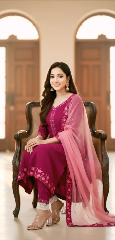 Ultra-realistic portrait of a beautiful young Indian woman sitting gracefully, smiling with elegance. She is wearing a deep magenta traditional outfit with delicate pink embroidered borders and a soft pink dupatta draped over her shoulder. Her outfit is paired with stylish transparent block-heeled sandals and lace ankle detailing. She has long, wavy hair styled neatly, minimal makeup, and striking statement earrings.