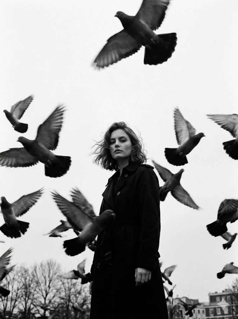 A low-angle, black and white photograph of a me (based on uploaded refrence) in a long black trench coat, standing amidst a flurry of pigeons flying overhead. The woman is looking directly at the viewer with a serious expression. The pigeons are blurred and in various stages of flight, creating a dynamic and slightly omino us atmosphere. The background is a stark, overcast sky and the hint of trees at the bottom. The overall mood is mysterious and dramzac.