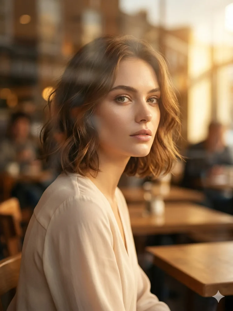 Image created using the attached original image. 100% real face. Hairstyle attached. Face and hairstyle reference. Close-up photo for the editor, as a reference. Sitting behind a coffee shop window during golden hour. Golden sunlight blends with the warm atmosphere of the room. Glowing skin. Natural chic style. Realism. Using a Canon EOS R5, 85mm f/1.2 lens, f/1.2 aperture, extra-shallow depth of field, gleaming porcelain skin, highly detailed fashion aesthetic, hyperrealism, 3:4 aspect ratio