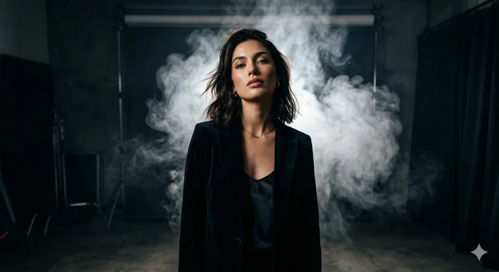 Ultra-realistic editorial portrait of a beautiful young woman standing in a dark studio. Dramatic white smoke behind her, a soft spotlight from the front right carving sharp shadows along her jaw and cheekbones. Moody cinematic lighting with deep contrast, soft highlights shimmering on her skin, a mysterious, confident expression, her head tilted slightly back
