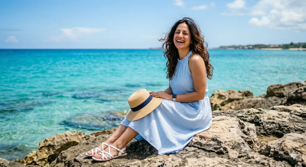 Create me a cheerful young woman sitting on rocks by the turquoise sea, wearing a pastel blue cute neck dress, holding a straw hat with a ribbon, her long hair . white cute sandals, bright summer sky, clear ocean water in the background, fresh and lively seaside photography. Don’t change the face of the uploaded image