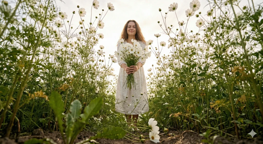 Ultra-realistic low-angle portrait (insect’s-eye view) of a young woman in a blooming white cosmos flower field. She holds a bouquet of white cosmos flowers close to her face, gently smelling them with a serene, dreamy expression. Her long wavy hair flows naturally.