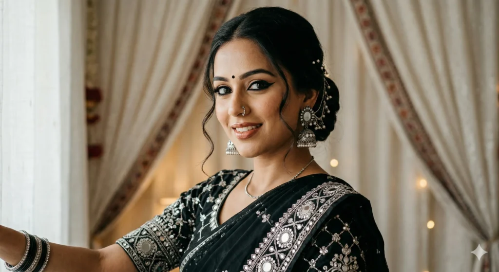 Close-up portrait of a young woman in traditional Indian attire, wearing a black embroidered blouse with mirror work and silver jhumkas. Elegant makeup with bold eyeliner, glossy lips, and a black bindi. Hair in a neat bun with loose strands and accessories. Soft-lit curtain background, ultra realistic, high-resolution, cinematic lighting, natural skin tone, sharp details.