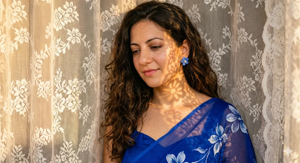 With this photo, create a dreamy, close-up portrait where warm sunlight filters through lace or floral cutouts, casting magical patterns on the skin. Her makeup is soft and romantic, and her expression is gentle, almost enchanted. She’s wearing a sheer cobalt blue white flower paint saree with a matching sweetheart neck blouse and matching accessories. Her long dark brown hair is messy open, and the shadows move as if telling a story. Style:soft glam,feminine, natural luxury.