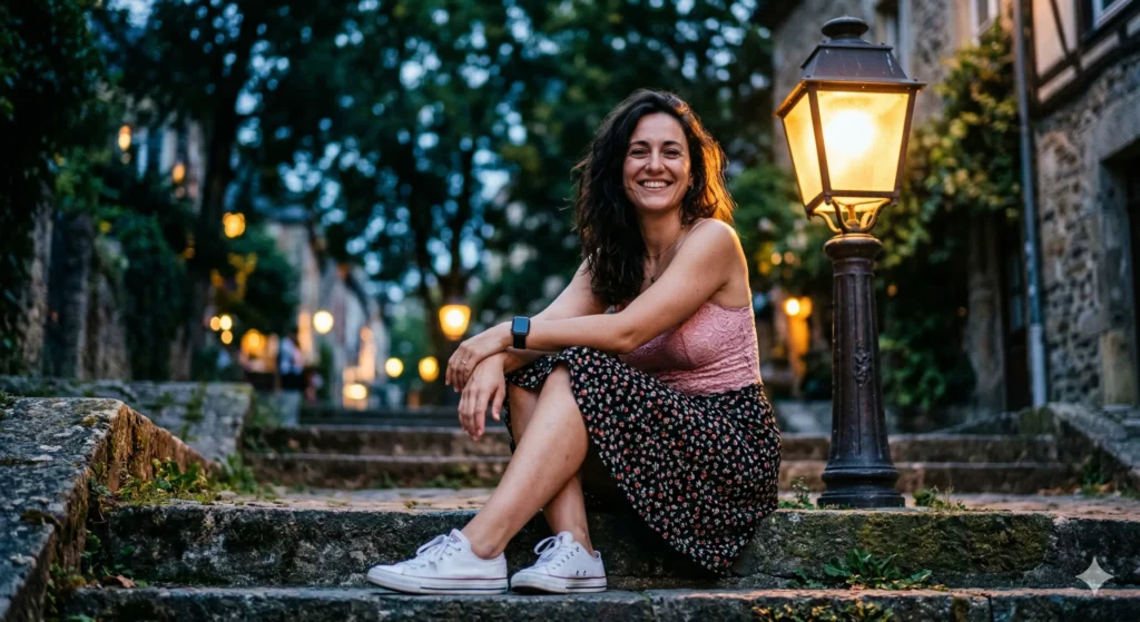 Cinematic hyper-realistic shot of a 25-year-old women sitting on stone stairs beside an old lamp post at twilight. nice smile,arms resting on knees. Outfit: pink lace top, black floral skirt, white sneakers, apple watch, slightly messy dark hair. Background: glowing streetlight, blurred trees, creamy bokeh, 8K detail.