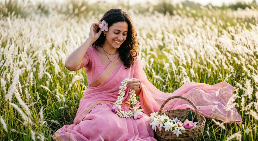 Google Gemini Prompts : Please create a 4k realistic picture where this girl is sitting on a kasful garden . She is wearing a pink chiffon saree with border and pink sleeve fitted blouse. She is tucking a small lotus flower behind her left ear.. she is making a flower Chaplet with white and pink flowers. Please don’t change the face. Make another one where she is trying to wear the flower crown.