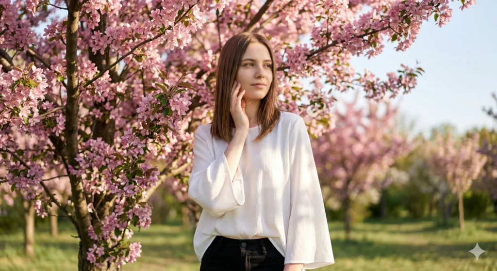 Create a realistic outdoor portrait of a young woman standing beside a tree with pink blossoms. She has straight shoulder-length brown hair and is wearing a loose white blouse with wide sleeves and black pants. She is gently touching her face with one hand while looking slightly to the side, in soft natural sunlight. Keep the facial features exactly the same, ensuring the face looks natural, realistic, and unchanged.