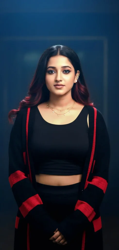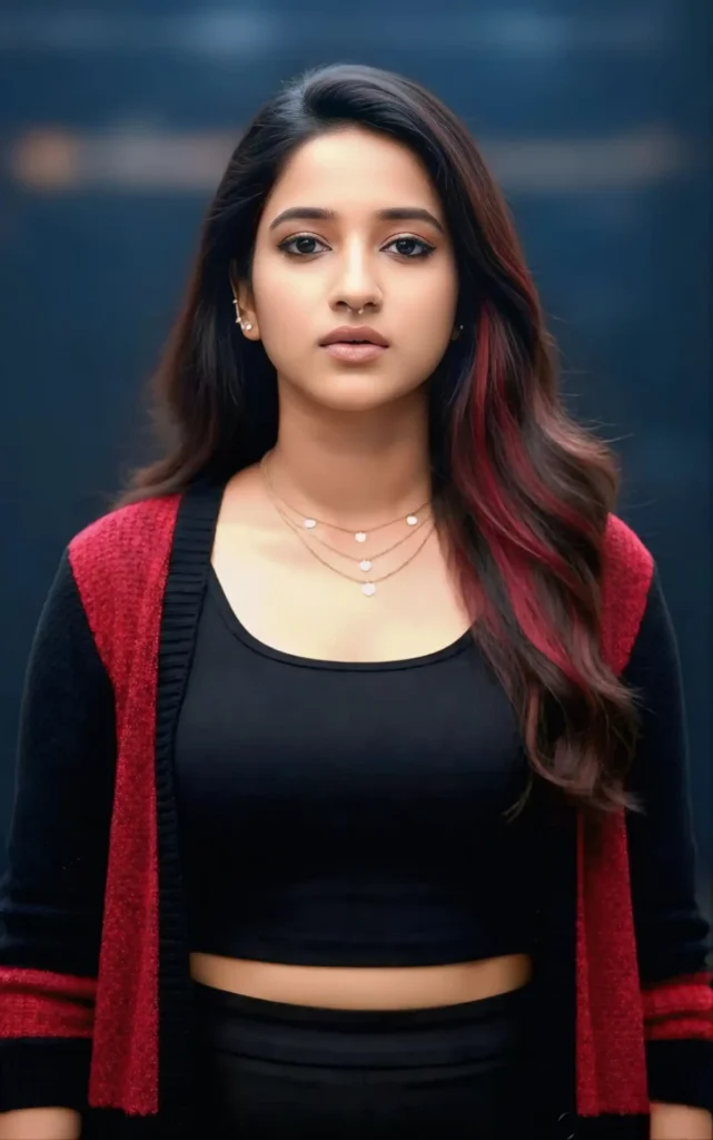 Transform the picture as she’s wearing a black crop fitted sleeveless top with red and black colour sweater. Inspired by lokha movie. Chandra character fitted neatly to her frame. Her long dark brown hair flows freely, with soft waves and a streak of deep red running through it, adding a bold and stylish touch. On her face her makeup is subtle yet powerful skin looks smooth and glowing, with a natural finish. Her eyes are highlighted with dark eyeliner only in the lower lashline and softly blended eyeshadow, giving her a sharp, intense gaze. Her lips are natural with a soft nude shade, so the focus stays on her eyes. For jewelry, she wears a small septum nose ring very simple that adds edge, delicate ear cuffs climbing her ear for a trendy look, and a fine necklace with a multy chain with tiny pendants that catches the light. The backdrop behind her is moody and cinematic. Her eyes are highlighted with dark eyeliner only in the lower lashline and softly blended eyeshadow, giving her a sharp, intense gaze. Her lips are natural with a soft nude shade, so the focus stays on her eyes. For jewelry, she wears a small septum nose ring very simple that adds edge, delicate ear cuffs climbing her ear for a trendy look, and a fine necklace with a multy chain with tiny pendants that catches the light. The backdrop behind her is moody and cinematic a deep darktone that makes her glowing face walking out like she’s in a dramatic movie scene.