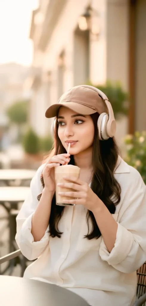 Make a photoshoot of me in a candid photo of a stylish young woman sitting at an outdoor café, wearing oversized headphones, a brown baseball cap, and a loose cream shirt, sipping iced coffee that’s on the first photo hold the cup, relaxed neutral tones, cozy lifestyle aesthetic, soft daylight . Make it photorealistic, subject’s face should be the same as the given image.