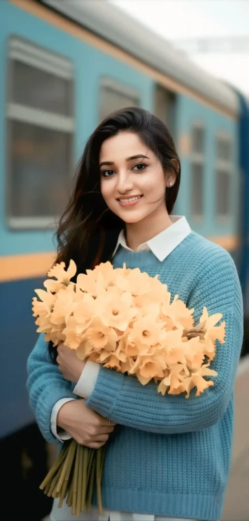 Edit this photo, A cinematic, moody portrait of a young woman standing outdoors, holding a large, abundant bouquet of vibrant yellow daffodils spilling over her arms. She wears a light blue knitted sweater instead of a leather jacket, layered over a white shirt. Her hair is windswept across her face, adding a sense of motion. The background shows a blurred moving train, creating a dynamic yet nostalgic atmosphere. The lighting is warm and dim, with a vintage film look, soft grain. Don’t change the face