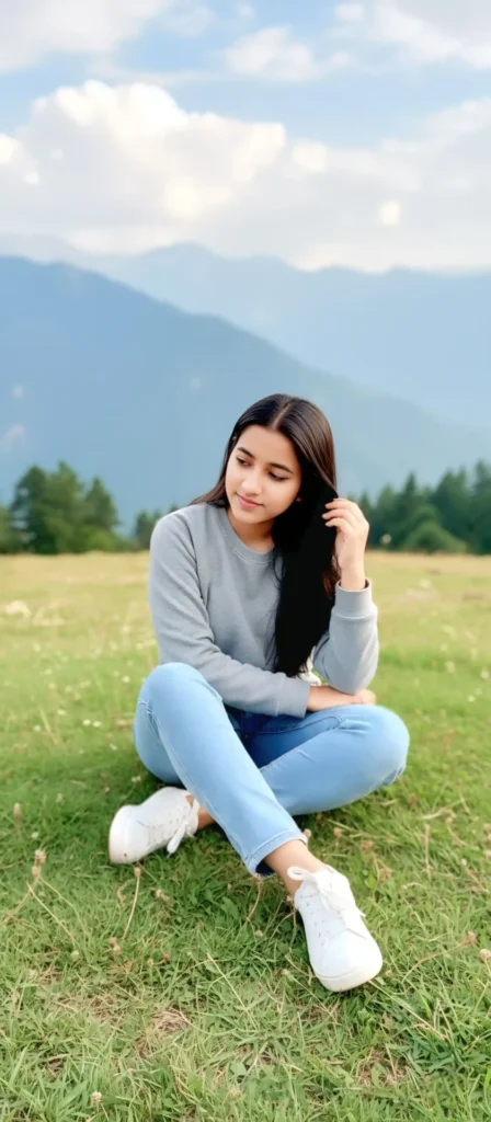 Google Gemini Prompts : Create a realistic outdoor portrait of a young woman sitting on grassy ground in a scenic mountain landscape. She has long straight dark brown hair and is wearing a grey sweatshirt, light blue jeans, and white sneakers. She is seated with one leg bent and the other folded, gently touching her hair with her hand while looking down with a soft expression. The background shows distant mountains, trees, and a cloudy sky. Keep the facial features exactly the same, making the face look natural.