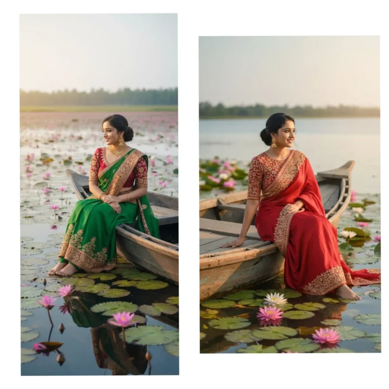 A Hyper-realistic 8k portrait of a young woman [use same face as uploaded photo] sitting barefoot on the edge of a rustic boat in calm blue waters. Lotuses all over the water, romantically environment. Her head tilted side in a gentle smile. She’s dressed in a beautiful sari, with a rich red blouse embroidered with a gold floral pattern. The skirt of the sari is a green, with intricate golden embroidery at the hem Her hair is pulled up in a relaxed bun, and she wears stunning gold earrings that complement her traditional look. The warm, soft lighting create a serene and elegant atmosphere. Need 100% face accuracy.