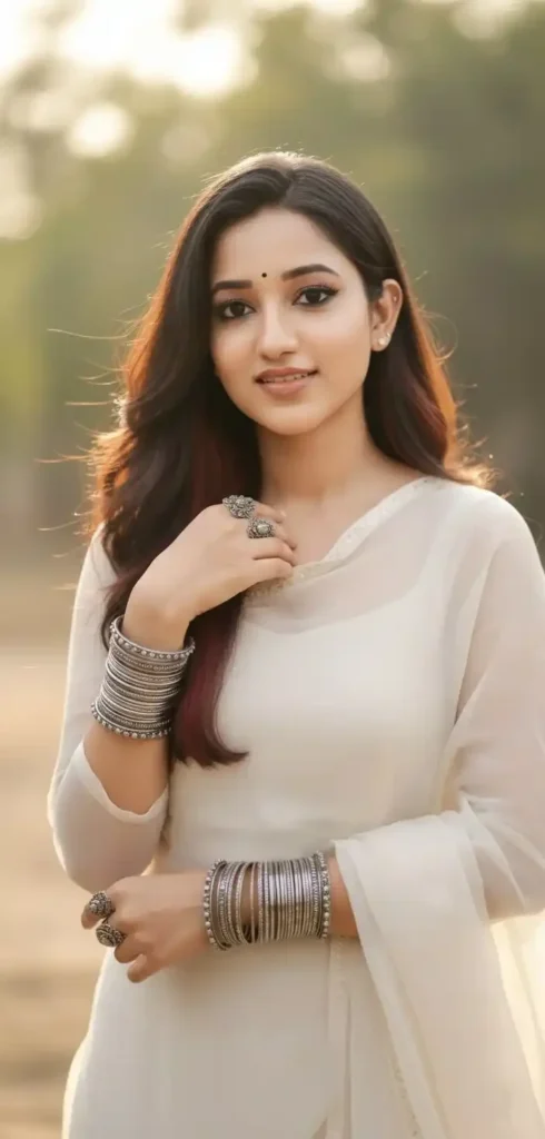 Create a 4K, ultra-realistic portrait in 9:16 ratio of me with the exact same face as the uploaded image and body (no alteration, 100% identical). I am wearing a light off white sheer kurti. My arms are adorned with silver oxidised bangles with oxidised rings, layered bangles I am also wearing a bold Kajal and eyeliner in my eyes with long eyelashes.matching earrings, My little flicks flows in light breeze. My makeup is soft yet glamorous, with defined eyes and a subtle glossy finish.
