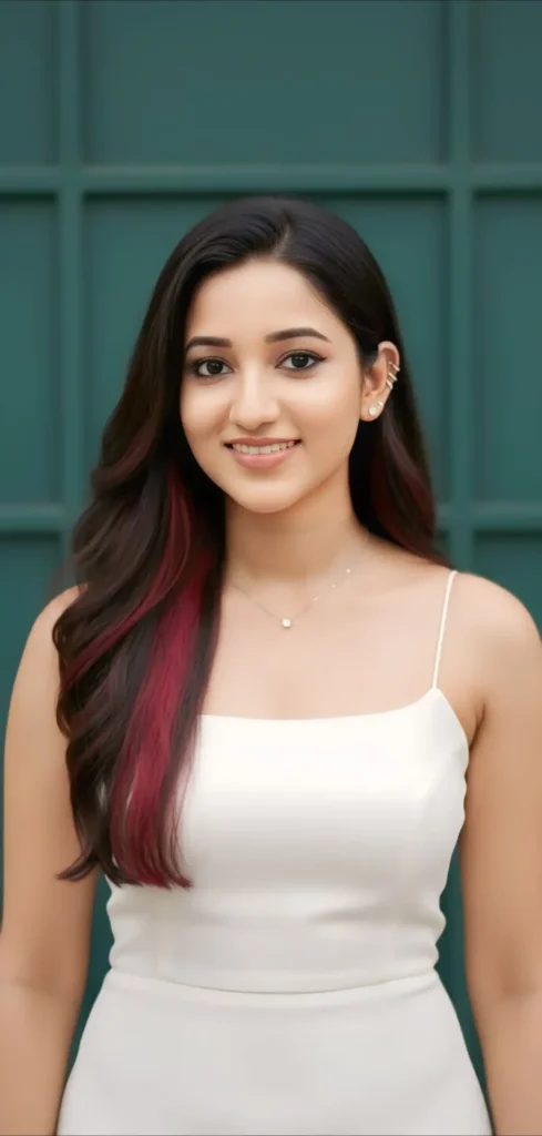 Transform the picture as she’s wearing a simple but elegant white dress with thin straps, fitted neatly to her frame. Her long dark brown hair flows freely, with soft waves and a streak of deep red running through it, adding a bold and stylish touch. On her face her makeup is subtle yet powerful skin looks smooth and glowing, with a natural finish. Her eyes are highlighted with dark eyeliner only in the lower lashline and softly blended eyeshadow, giving her a sharp, intense gaze. Her lips are natural with a soft nude shade, so the focus stays on her eyes. For jewelry, she wears a small septum ring very simple that adds edge, delicate ear cuffs climbing her ear for a trendy look, and a fine necklace with a tiny pendant that catches the light. The backdrop behind her is moody and cinematic a deep greenish tone that makes her white dress and glowing face stand out like she’s in a dramatic movie scene. Need 100% face accuracy