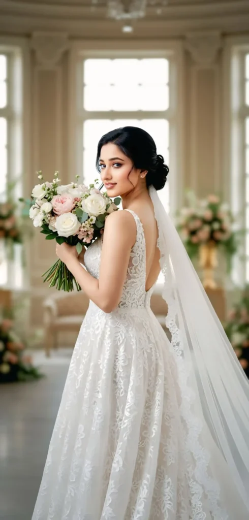 A hyper-realistic bridal portrait of a beautiful bride holding a bouquet of fresh flowers close to her face. She is wearing an elegant lace embroidered bridal gown, sleeveless with a daring V-cut back design, perfectly fitted to her figure. The gown is intricate, detailed, and delicate just like the reference photo. A long sheer veil flows softly behind her. Her hair is styled in a loose romantic bun with gentle strands framing her face, matching the hairstyle in the reference. Don’t change the face of the uploaded image