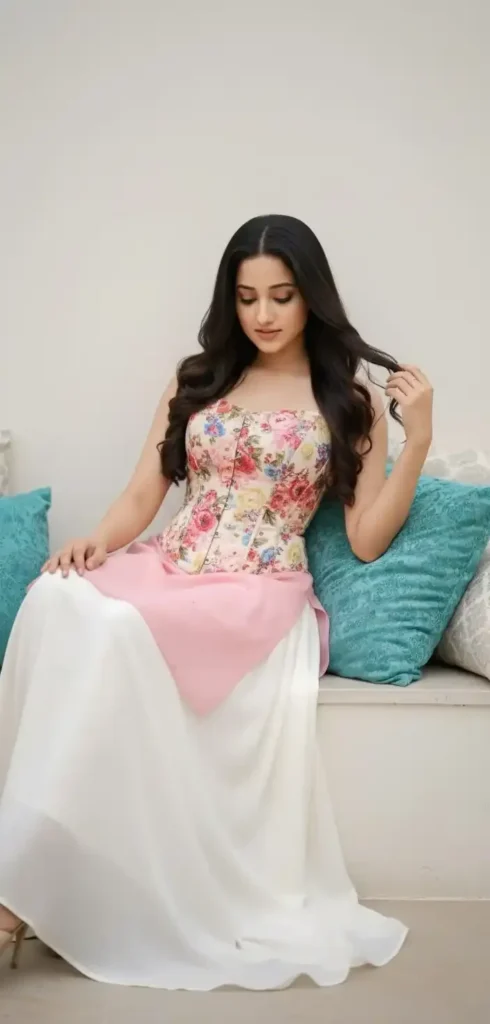 Create, 4K HD, realistic portrait high-quality, professional, full-body studio portrait of a young pakistani women with long hair, sitting on a white stone ledge ,indoors with cusions there. She’s leaning against a turquoise pillow with a pattern. She is wearing a baby pink pakistani shalwar kameez dress with a floral, multi-colored corset top and a long white skirt. She’s looking down and touching her hair with her left hand. Not editing face and same as uploaded person 100 % same feature