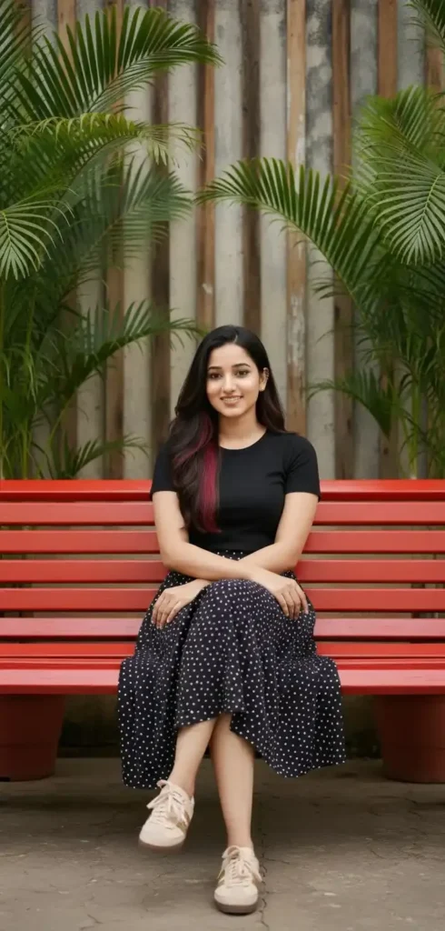 A young woman with long, dark hair is seated on a bright red wooden bench. She is wearing a black t-shirt and a black skirt with white polka dots. Her feet are adorned with light-colored, possibly beige or off-white, samba sneakers. Her arms rest gently on her lap and the bench.