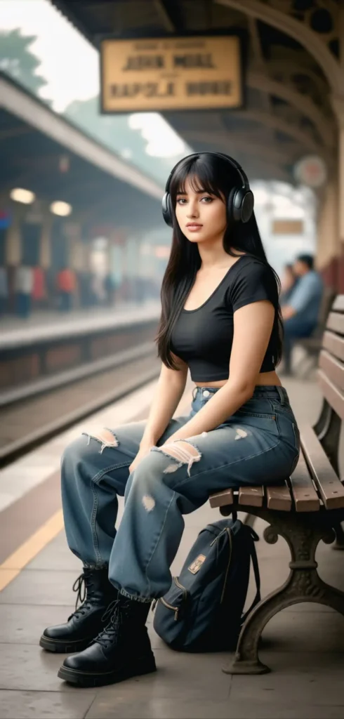 Make my picture a realistic photo of a girl sitting on a train station. She is wearing a black retro crop top and a baggy tattered pants and black boots. She is wearing headphones with a long straight black hair with bangs. Make it look realistic as possible with the same face features.