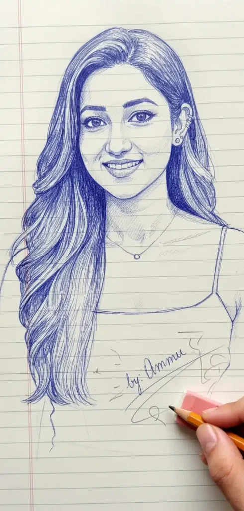 Make a photo style drawing line sketch ink blue and white about a face (details of the face exactly the same as in the uploaded object), intricate details, normal background note book page and right finger holding pen and eraser, signature sketch connected with potlot written ” by: [Ammu] with art scratch.