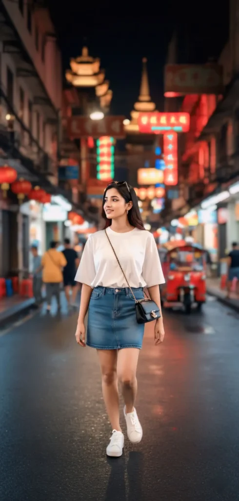 Ultra-realistic street photography of a stylish Indian woman exploring Thailand’s Chinatown, Yaowarat. She wears a white oversized t-shirt, straight blue denim mini skirt, white sneakers, and minimal accessories like sunglasses or a shoulder bag. Standing or walking in a vibrant alley with old shops, Tuk Tuks, and temple pagodas. Foreground slightly blurred, with passersby and moving vehicles adding realism. Neon night lights create a cinematic urban-minimalist mood, 9:16 aspect ratio.