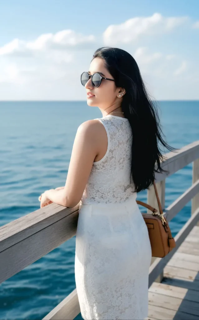 A stylish woman stands on a wooden pier, looking out at the ocean under a clear sky. She has long, dark hair and is wearing sunglasses, a white lace top, and a white skirt. A brown handbag hangs from her arm. The water is a deep blue, and there are a few wispy clouds in the sky.