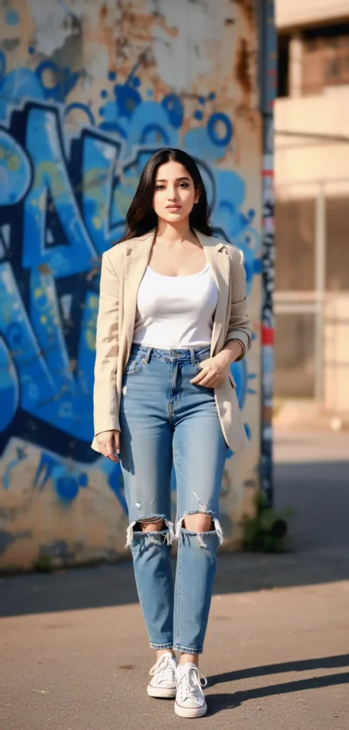 Ultra-realistic full-body portrait of an slim woman with long hair, standing outdoors in front of a blue and white graffiti-covered warehouse wall. She wears a white tank top, beige oversized blazer, high-waisted distressed light-wash jeans, and white sneakers. Bright, sunny urban setting with street-fashion vibes. High-quality, photorealistic, 8K. Keep her face and pose unchanged
