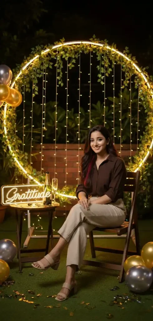 A young girl sitting casually on chair in an outdoor decorated setup at night. The background features a glowing neon ring decorated with green vines and colorful fairy lights, giving a vibrant festive vibe. Add a sucess celebration touch to the scene. She is dressed in a dark brown shirt, beige pants and stylish heel with a relaxed and confident pose. The atmosphere cozy, with warm lighting named (Gratitude).