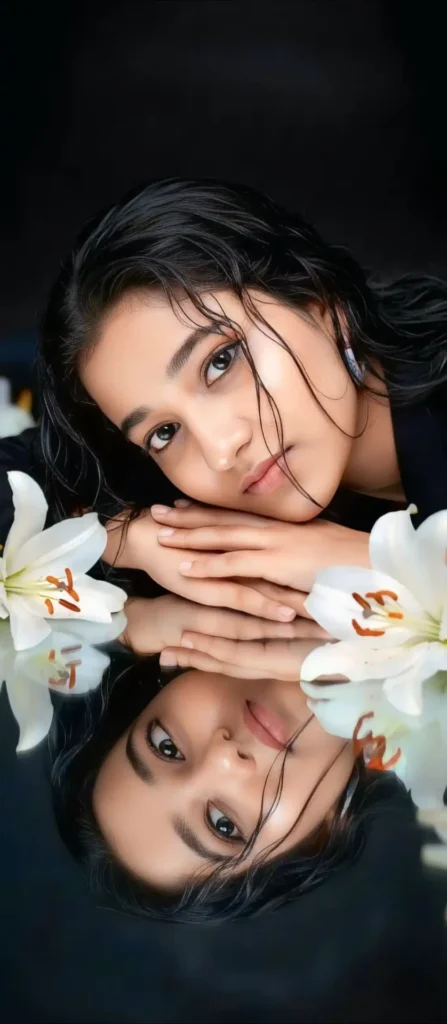 A dreamy portrait of a beautiful woman lying gracefully beside white lilies, her head resting gently on her arms, reflected perfectly on a glossy black surface. Soft cinematic lighting highlights her glowing skin and delicate facial features, with wet strands of hair framing her face. The mood is ethereal, romantic, and artistic, with a serene atmosphere, ultra realistic, high detail, professional studio photography, 8K