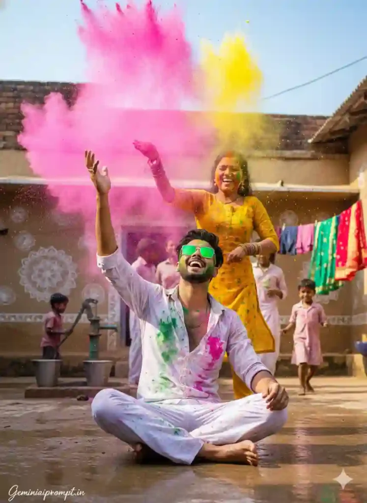 FACE LOCK – STRICT MATCH Use uploaded face reference only. Keep face 100% unchanged. No beautification. No reshaping. No AI smoothing. Maintain natural pores and skin texture. SCENE CONCEPT Ultra-realistic cinematic rural Holi scene. Foreground: Young man wearing white loose trousers and partially unbuttoned white shirt soaked in Holi colors. He is sitting on wet ground, laughing joyfully, one hand raised to protect from splash. Green reflective sunglasses slightly tilted. A woman beside him throws a handful of bright pink and yellow powder into the air. Powder clouds suspended mid-air creating dramatic color burst. Background: Village courtyard with mud houses painted with white traditional rangoli patterns. A group of friends dancing and throwing colors. Steel water buckets placed near a hand pump. Bright sari fabrics hanging from wall. Wet ground reflecting colors like a mirror. LIGHTING DETAILS Bright noon sunlight. Soft natural shadows. Color powder glowing in backlight. Cinematic vibrant grading. Natural skin tones preserved. CAMERA & QUALITY Low-angle energetic framing. Ultra-detailed 8K resolution. Sharp crystal-clear face detail. High-speed action capture. Professional DSLR realism. Lively cinematic composition. TEXT / SIGNATURE Add “Geminiaiprompt.in” at the bottom-left corner, HANDWRITTEN SIGNATURE-STYLE typography, thin cursive strokes, small size, subtle premium elegance, white or soft off-white color. NEGATIVE PROMPT low quality, blur, CGI appearance, cartoon style, plastic skin, distorted limbs, oversharpening artifacts, watermark (except signature), artificial lighting. ASPECT RATIO • 3:4 vertical