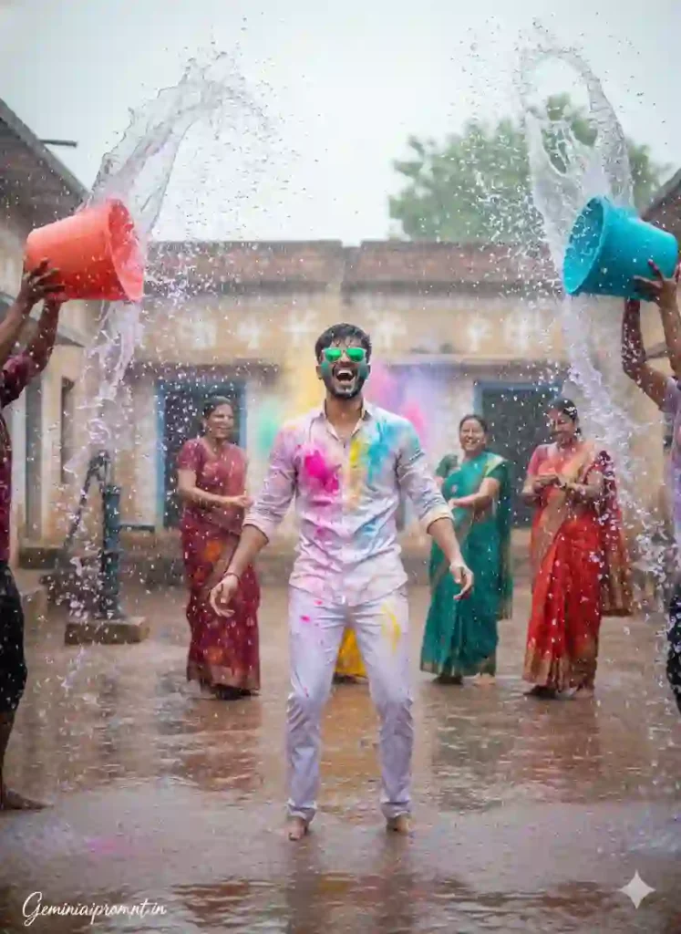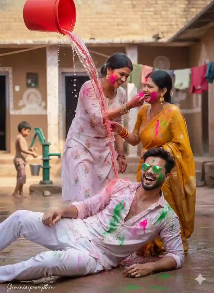 FACE CLARITY LOCK (MAIN SUBJECT) Use the uploaded reference face for the main young man. Face must remain EXACTLY the same. Do NOT change: Facial structure Beard pattern Eye shape Skin tone Expression No beautification. No smoothing. No reshaping. Natural skin pores and real human texture must stay visible. No AI-stylized look. SCENE DESCRIPTION Ultra-realistic joyful Holi celebration in a rural Indian village courtyard. Foreground: A smiling young man wearing white cotton pants and an open white shirt now splashed with bright pink, green, and orange Holi colors. He is lying playfully on the wet mud ground, laughing, slightly propped up on one elbow. Green reflective sunglasses catching sunlight. A cheerful woman in a floral printed kurta pours a bucket of vibrant red-tinted water over him mid-action — water frozen in air with high-speed photography feel. Midground: Another man gently applying bright pink color on a woman wearing a yellow sari with traditional bangles and earrings. Their laughter visible naturally. Background: Mud-plastered village homes decorated with white hand-painted folk art patterns. A child near a hand pump playing with small metal buckets. Clothes drying on rope line. Ground fully wet with splashes of bright Holi colors blending together. LIGHTING Bright natural daylight. Warm sunlight illuminating water droplets. Soft natural shadows. Vivid yet realistic color grading. High dynamic range. No oversaturation. CAMERA & QUALITY Vertical cinematic framing. Ultra HD 8K clarity. Sharp facial focus. High-speed splash capture effect. DSLR professional photography look. Realistic depth of field. TEXT / SIGNATURE Add “Geminiaiprompt.in” at the bottom-left corner, HANDWRITTEN SIGNATURE-STYLE typography, thin cursive strokes, small size, subtle premium elegance, white or soft off-white color. NEGATIVE PROMPT cartoon style, CGI look, over-smooth skin, blur, low resolution, distorted anatomy, artificial glow, watermark (except signature), exaggerated color saturation. ASPECT RATIO • 3:4 vertical