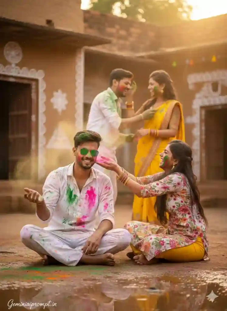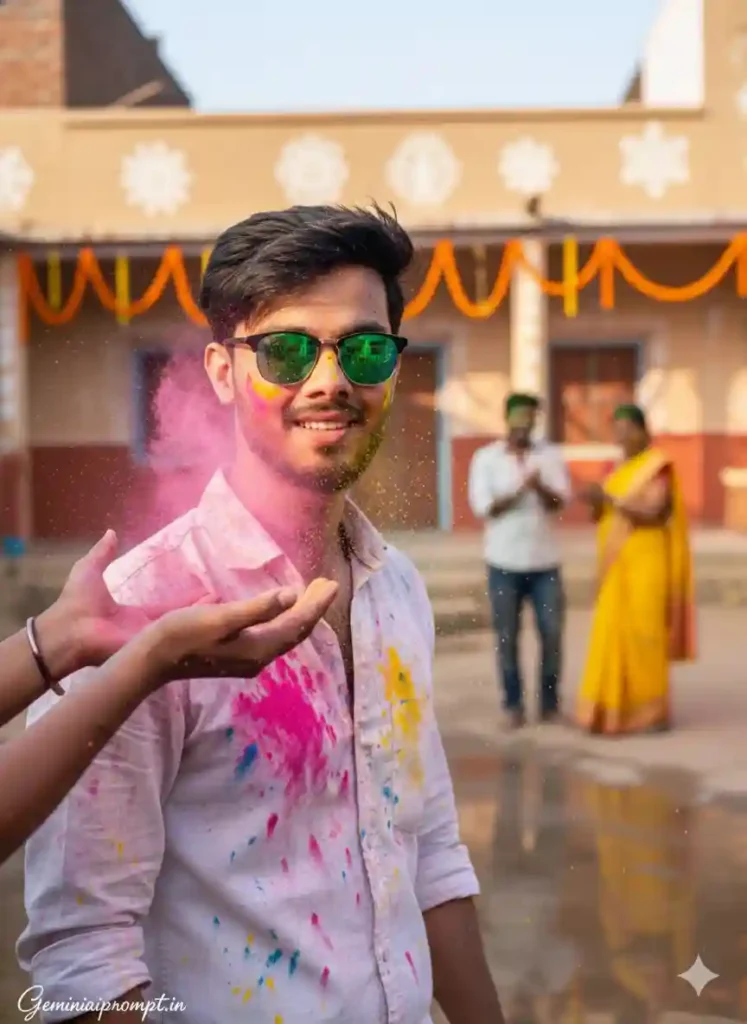 FACE LOCK – EXACT IDENTITY PRESERVATION Use uploaded face reference only. Face must remain 100% unchanged. No beautification. No reshaping. No smoothing. Natural human texture must remain visible. SCENE CONCEPT Ultra-realistic cinematic rural Holi scene during golden evening light. Foreground: The young man sitting on wet courtyard ground smiling naturally. White shirt now heavily splashed with Holi colors. Green reflective sunglasses slightly lowered. One hand raised as colored powder falls over him. Beside him: A woman in bright floral kurta laughing while applying pink color on his cheek. Midground: A man gently applying green powder on a woman wearing yellow sari with bangles. Soft laughter and joyful expressions visible. Background: Mud-plastered houses glowing under warm sunset light. White rangoli-style art patterns on walls. Soft dust particles floating in air. Wet ground reflecting golden light and colors. Color powder floating in slow drifting clouds. LIGHTING DETAILS Warm golden hour sunlight. Soft rim lighting on hair and shoulders. Natural warm highlights. Deep soft shadows. Cinematic rich tone. CAMERA & QUALITY Vertical cinematic portrait composition. Mid-shot framing. Ultra HD 8K clarity. Sharp crystal-clear face detail. Professional DSLR look. Natural depth separation. TEXT / SIGNATURE Add “Geminiaiprompt.in” at the bottom-left corner, HANDWRITTEN SIGNATURE-STYLE typography, thin cursive strokes, small size, subtle premium elegance, white or soft off-white color. NEGATIVE PROMPT low quality, blur, CGI appearance, cartoon style, plastic skin, distorted limbs, oversharpening artifacts, watermark (except signature), artificial lighting. ASPECT RATIO • 3:4 vertical