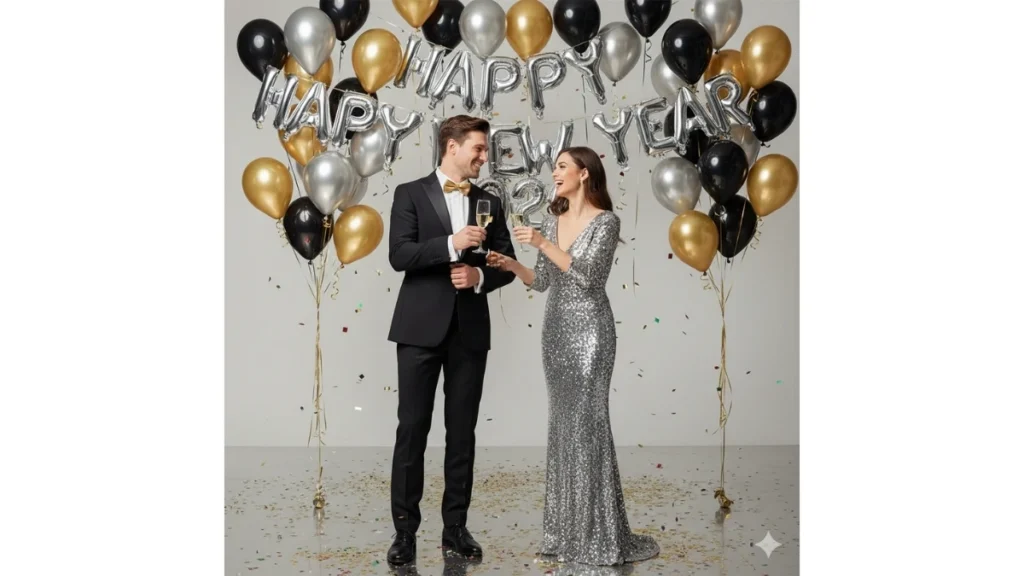 “Cinematic 8K New Year 2026 couple portrait with exact face matching from uploaded images. The couple stands joyfully, holding champagne glasses mid-toast. Elegant black, gold, and silver balloons float behind them with metallic ‘Happy New Year 2026’ text. Studio lighting, crisp highlights, realistic reflections, vibrant festive colors, ultra-clean textures, and a joyful celebration atmosphere.”