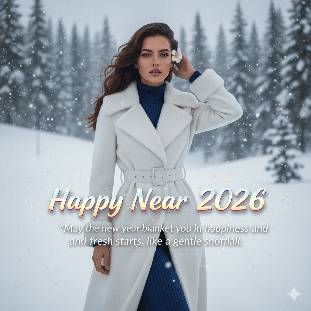 Create a modern, high-definition image—vibrant and crisp—based on the uploaded picture. The girl should be wearing a luxurious full-length winter white cashmere coat with a dramatic oversized collar, cinched waist belt, and subtle fur trim at the cuffs and hem, layered over a sleek midnight blue turtleneck sweater dress, high-fashion lifestyle editorial portrait style. The vibe must capture the essence of a '90s movie 'baddie,' with dark brown, silky hair and a small flower tucked visibly into her hair, enhanced by a windy, romantic atmosphere. She is standing in a snowy landscape with fresh white powder covering gentle slopes and evergreen trees, where soft falling snowflakes add a magical touch, creating a cozy and renewing cinematic effect. Her pose should suggest that she is adjusting her hair. The girl's face must remain exactly the same as in the provided reference photo, with no alterations. Overlay the positive New Year quote in a sleek, modern sans-serif font with vibrant gradients, playful animations like subtle sparkles, and an energetic glow to evoke joy and excitement: "May the new year blanket you in happiness and fresh starts, like a gentle snowfall." Also overlay the highlighted text "Happy New Year 2026" prominently in a bold, contemporary script with iridescent colors, dynamic shadows, and festive confetti effects to stand out as the main greeting, perfect for social media shares.